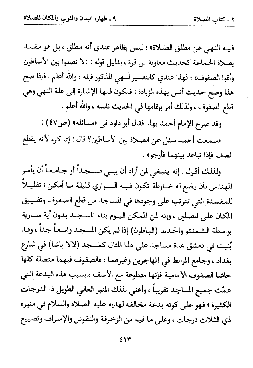 ولذلك أقول: إنه ينبغي لمن أراد أن يبني مسجدا أو جامعا أن يأمر المهندس بأن يضع له خارطة تكون فيه السواري قليلة ما أمكن تقليلا للمفسدة التي تترتب على وجودها في المساجد من قطع الصفوف وتضييق المكان على المصلين وإنه لمن الممكن اليوم بناء المسجد بدون أية سارية بواسطة الشمنتو والحديد (الباطون) إذا لم يكن المسجد واسعا جدا وقد بنيت في دمشق عدة مساجد على هذه المثال كمسجد (لالا باشا) في شارع بغداد وجامع المرابط في المهاجرين وغيرهما فالصفوف فيهما متصلة كلها حاشا الصفوف الأمامية فإنها مقطوعة مع الأسف بسبب هذه البدعة التي عمت جميع المساجد تقريبا وأعني بذلك المنبر العالي الطويل ذا الدرجات الكثيرة فهو على كونه بدعة مخالفة لهديه عليه الصلاة والسلام في منبره ذي الثلاث درجات وعلى ما فيه من الزخرفة والنقوش والإسراف وتضييع