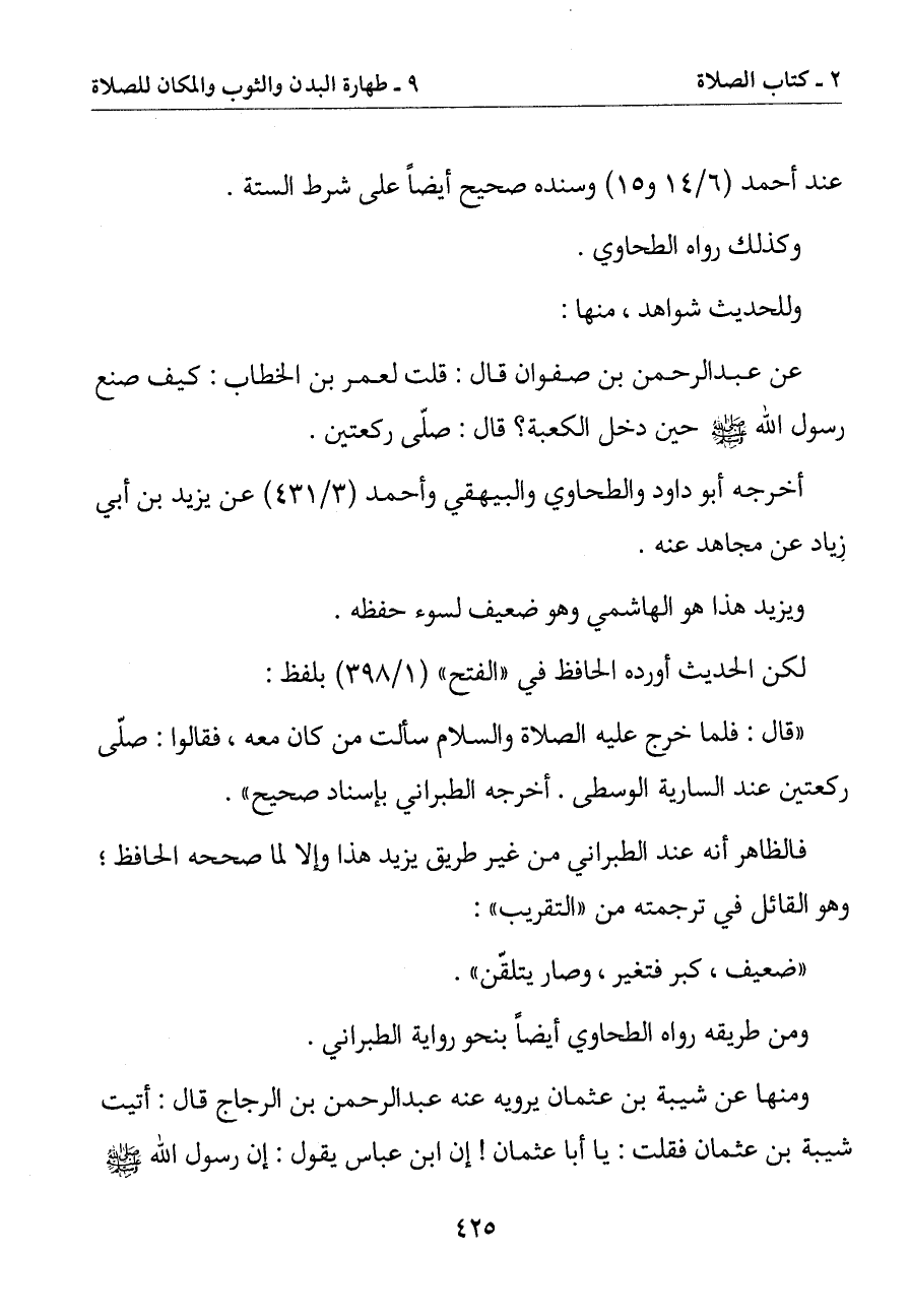 عن عبد الرحمن بن صفوان قال: قلت لعمر بن الخطاب: كيف صنع رسول الله صلى الله عليه وسلم حين دخل الكعبة؟ قال: صلى ركعتين
