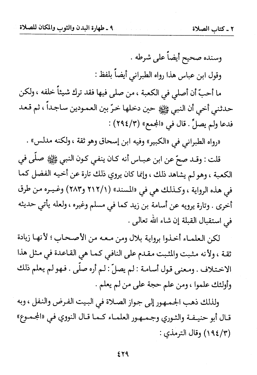 ما أحب أن أصلي في الكعبة من صلى فيها فقد ترك شيئا خلفه ولكن حدثني أخي أن النبي صلى الله عليه وسلم حين دخلها خر بين العمودين ساجدا ثم قعد فدعا ولم يصل. قال في (المجمع):