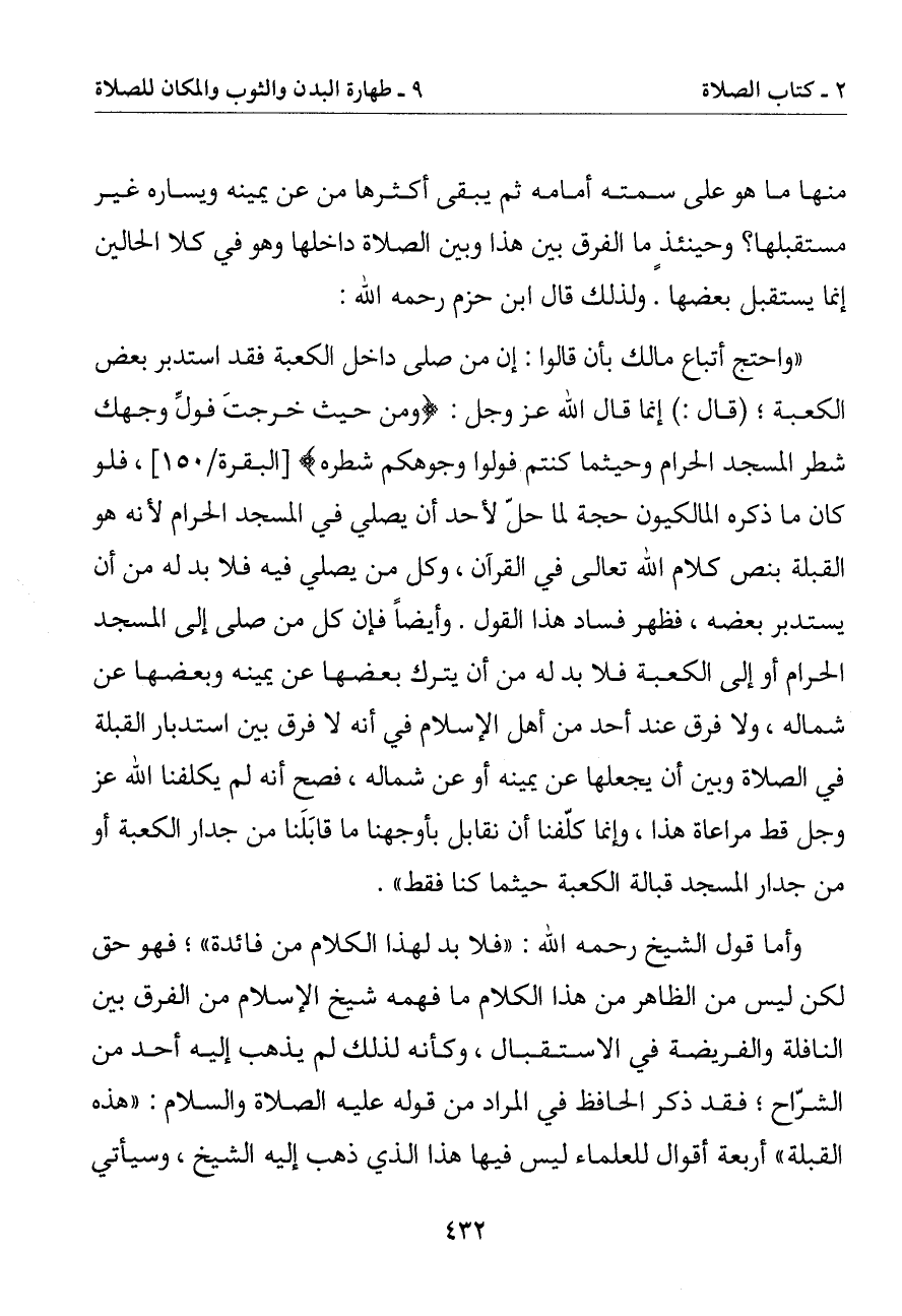 (واحتج أتباع مالك بأن قالوا: إن من صلى داخل الكعبة فقد استدبر بعض الكعبة (قال:) إنما قال الله عز وجل: {ومن حيث خرجت فول وجهك شطر المسجد الحرام وحيثما كنتم فولوا وجوهكم شطره} [البقرة: 150] فلو كان ما ذكره المالكيون حجة لما حل لأحد أن يصلي في المسجد الحرام لأنه هو القبلة بنص كلام الله تعالى في القرآن وكل من يصلي فيه فلا بد له من أن يستدبر بعضه فظهر فساد هذا القول. وأيضا فإن كل من صلى إلى المسجد الحرام أو إلى الكعبة فلا بد له من أن يترك بعضها عن يمينه وبعضها عن شماله ولا فرق عند أحد من أهل العلم في أنه لا فرق بين استدبار القبلة في الصلاة وبين أن يجعلها عن يمينه أو عن شماله فصح أنه لم يكلفنا الله عز وجل قط مراعاة هذا وإنما كلفنا أن نقابل بأوجهنا ما قابلنا من جدار الكعبة أو من جدار المسجد قبالة الكعبة حيثما كنا فقط)