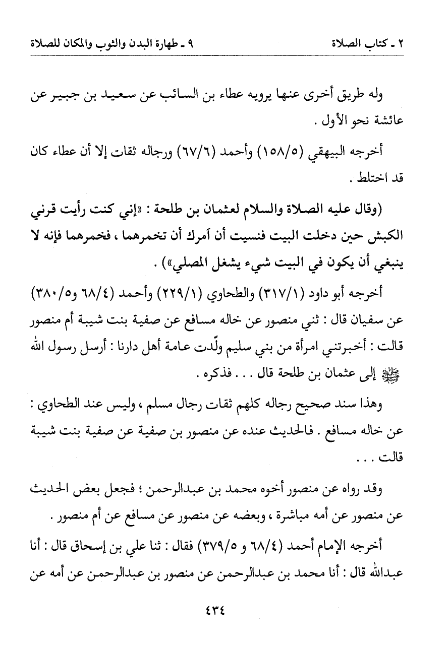 وهذا سند صحيح رجاله كلهم ثقات رجال مسلم وليس عند الطحاوي: عن خاله مسافع. فالحديث عنده عن منصور بن صفية عن صفية بنت شيبة قالت