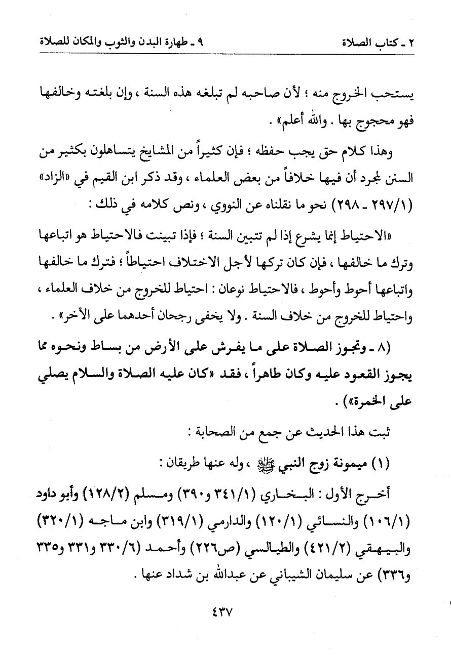 يستحب الخروج منه لأن صاحبه لم تبلغه هذه السنة وإن بلغته وخالفها فهو محجوج بها. والله أعلم). وهذا كلام حق يجب حفظه فإن كثيرا من المشايخ يتساهلون في كثير من السنن لمجرد أن فيها خلافا من بعض العلماء وقد ذكر ابن القيم في (الزاد) نحو ما نقلناه عن النووي ونص كلامه في ذلك: