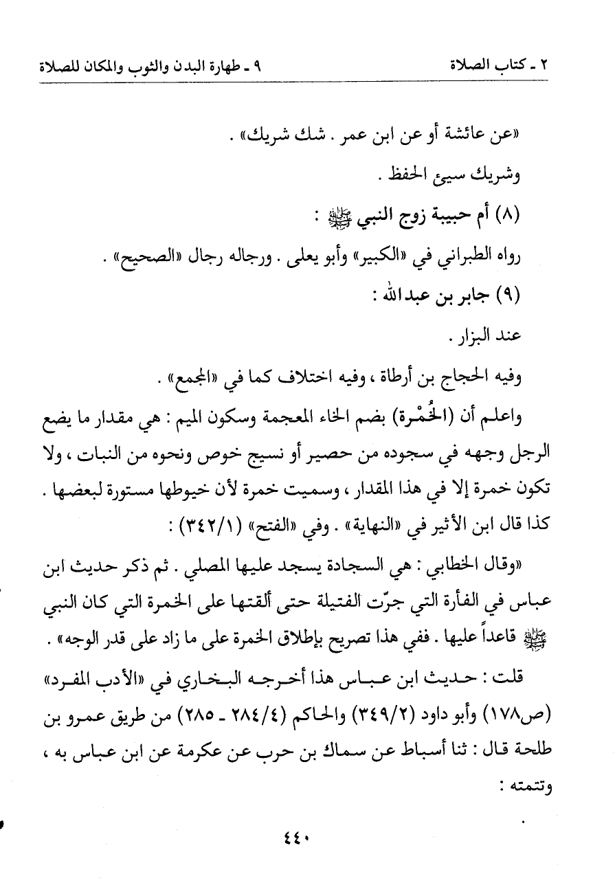 واعلم أن (الخمرة) بضم الخاء المعجمة وسكون الميم: هي مقدار ما يضع الرجل وجهه في سجوده من حصير أو نسيج خوص ونحوه من النبات ولا تكن خمرة إلا في هذا المقدار وسميت خمرة لأن خيوطها مستورة لبعضها. كذا قال ابن الأثير في (النهاية). وفي (الفتح):