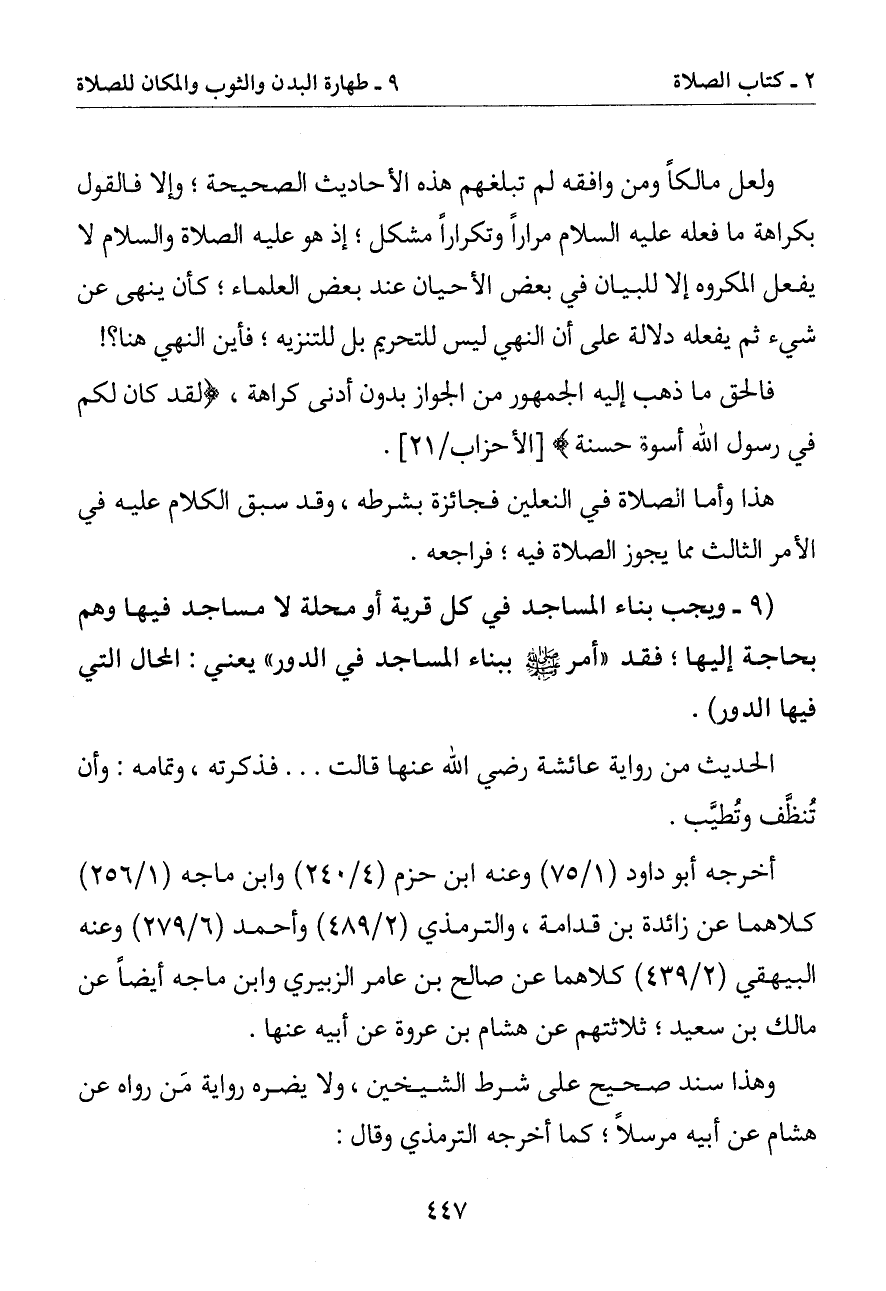 (9 - ويجب بناء المساجد في كل قرية أو محلة لا مساجد فيها وهم بحاجة إليها فقد (أمر صلى الله عليه وسلم ببناء المساجد في الدور) يعني: المحال التي فيها الدور)
