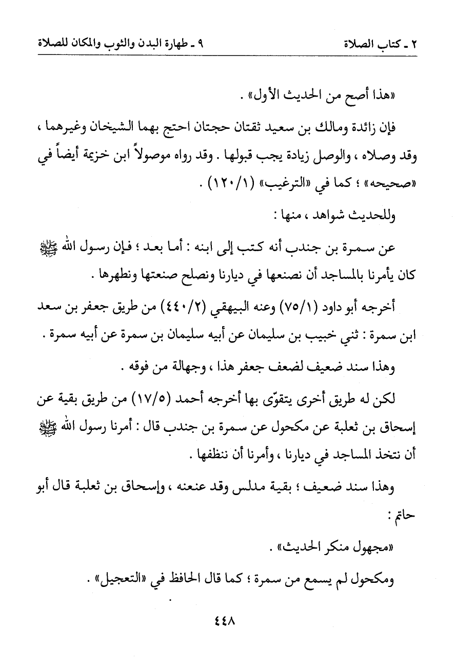 لكن له طريق أخرى يتقوى بها أخرجه أحمد من طريق بقية عن إسحاق بن ثعلبة عن مكحول بن سمرة بن جندي قال: أمرنا رسول الله صلى الله عليه وسلم أن نتخذ المساجد في ديارنا وأمرنا أن ننظفها