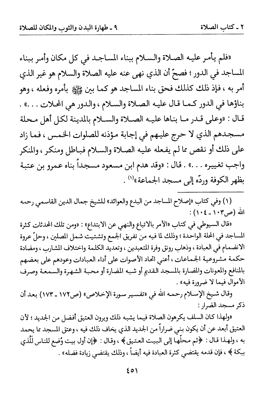(فلم يأمر عليه الصلاة والسلام ببناء المساجد في كل مكان وأمر ببناء المساجد في الدور فصح أن الذي نهى عنه عليه الصلاة والسلام هو غير الذي أمر به فإذ ذلك كذلك فحق بناء المساجد هو كما بين صلى الله عليه وسلم بأمره وفعله وهو قال: (وعلى قدر ما بناها عليه الصلاة والسلام والدور هي المحلات. . .). مسجدهم الذي لا حرج عليهم في إجابة مؤذنه للصلوات الخمس فما زاد على ذلك أو نقص مما لم يفعله عليه الصلاة والسلام فباطل ومنكر والمنكر واجب تغييره. . .). قال: (وقد هدم ابن مسعود مسجدا بناه عمرو بن عتبة بظهر الكوفة ورده إلى مسجد الجماعة) (1)