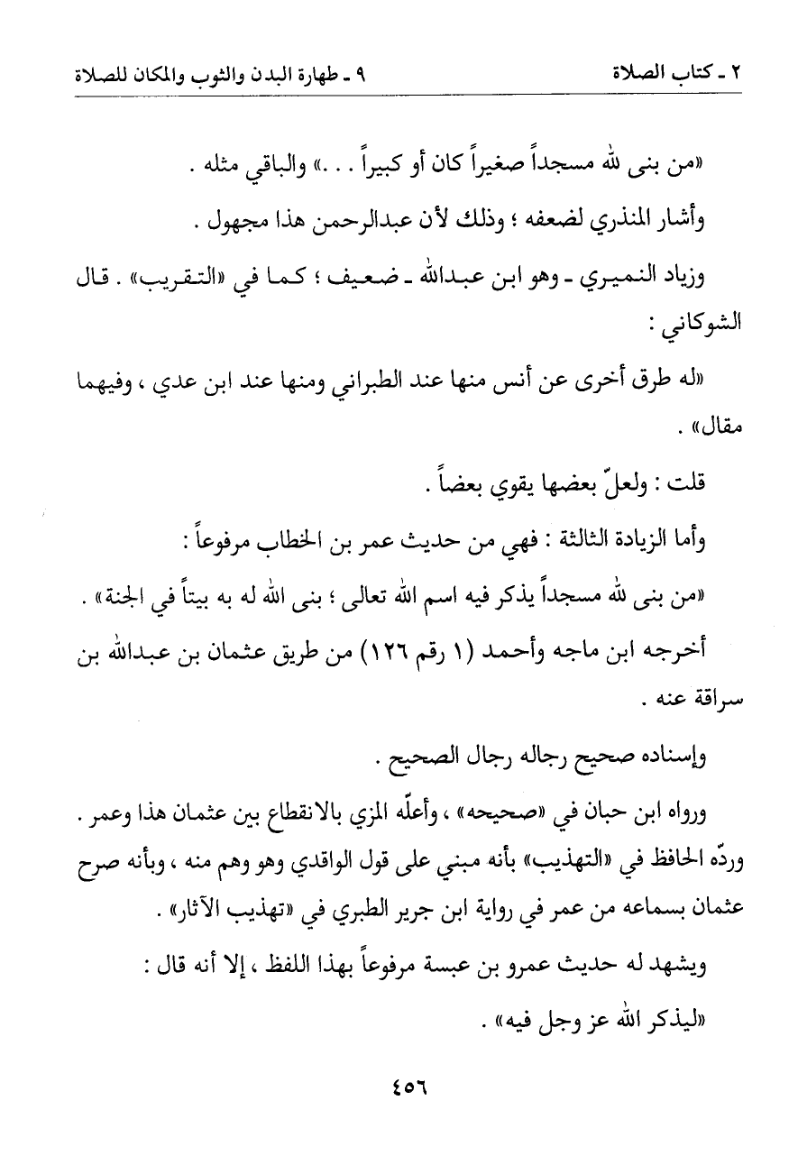 (من بنى لله مسجدا صغيرا كان أو كبيرا. . .) والباقي مثله