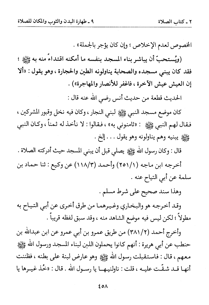 كان موضع مسجد النبي صلى الله عليه وسلم لبني النجار وكان فيه نخل وقبور المشركين فقال لهم النبي صلى الله عليه وسلم: (ثامنوني به) فقالوا: لا نأخذ له ثمنا وكان النبي صلى الله عليه وسلم يبنيه وهم يناولونه وهو يقول. . . إلخ