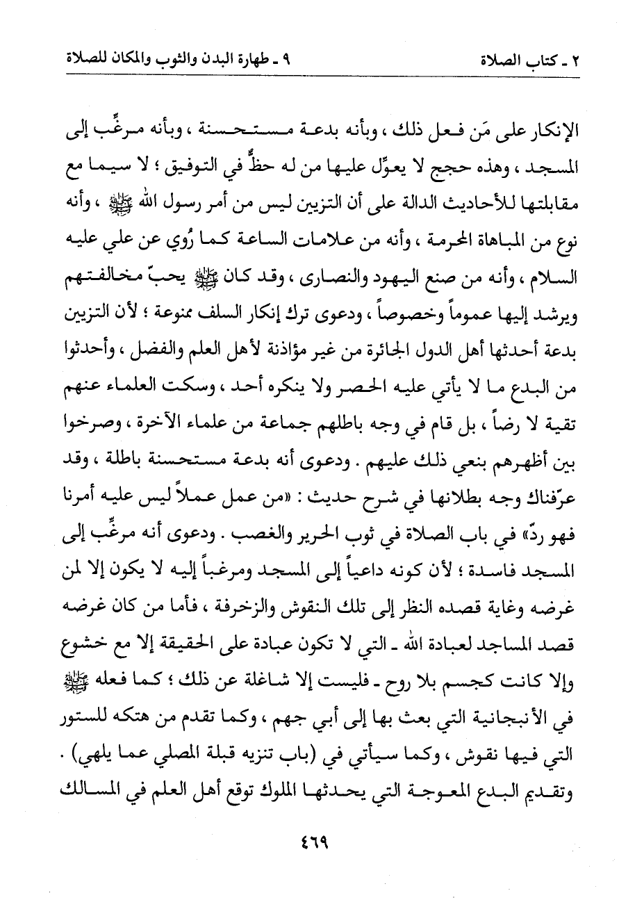 لأن التزيين بدعة أحدثها أهل الدول الجائرة من غير مؤاذنة لأهل العلم والفضل وأحدثوا من البدع ما لا يأتي عليه الحصر ولا ينكره أحد وسكت العلماء عنهم تقية لا رضا بل قام في وجه باطلهم جماعة من علماء الآخرة وصرخوا بين أظهرهم بنعي ذلك عليهم. ودعوى أنه بدعة مستحسنة باطلة وقد عرفناك وجه بطلانها في شرح حديث: (من عمل عملا ليس عليه أمرنا فهو رد) في باب الصلاة في ثوب الحرير والغصب. ودعوى أنه مرغب إلى المسجد فاسدة لأن كونه داعيا إلى المسجد ومرغبا إليه لا يكون إلا لمن غرضه وغاية قصده النظر إلى تلك النقوش والزخرفة فأما من كان غرضه قصد المساجد لعبادة الله - التي لا تكون عبادة على الحقيقة إلا مع خشوع وإلا كانت كجسم بلا روح - فليست إلا شاغلة عن ذلك كما فعله صلى الله عليه وسلم في الأنبجانية التي بعث بها إلى أبي جهم وكما تقدم من هتكه للستور التي فيها نقوش وكما سيأتي في (باب تنزيه قبلة المصلي عما يلهي) وتقديم البدع المعوجة التي يحدثها الملوك توقع أهل العلم في المسالك