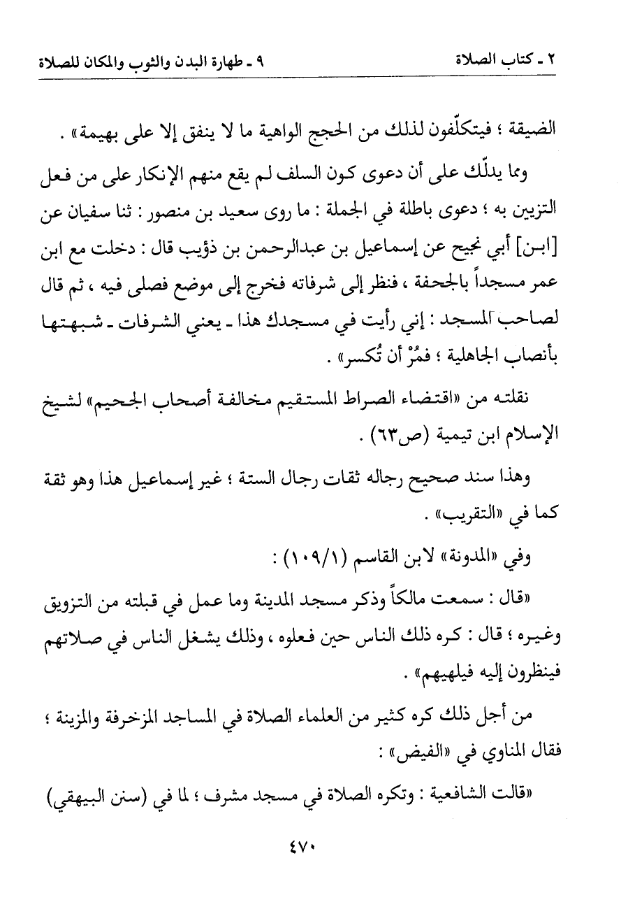 ومما يدلك على أن دعوى كون السلف لم يقع منهم الإنكار على من فعل التزيين به دعوى باطلة في الجملة: ما روى سعيد بن منور: ثنا سفيان عن [ابن] أبي نجيح عن إسماعيل بن عبد الرحمن بن ذؤيب قال: دخلت مع ابن عمر مسجدا بالجحفة فنظر إلى شرفاته فخرج إلى موضع فصلى فيه ثم قال لصاحب المسجد: إني رأيت في مسجدك هذا - يعني الشرفات - شبهتها بأنصاب الجاهلية فمر أن تكسر)