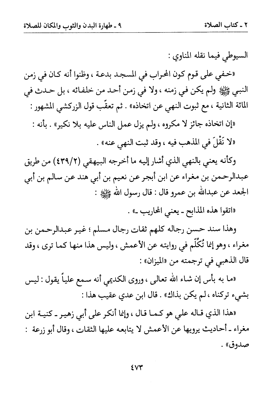 (خفي على قوم كون المحراب في المسجد بدعة وظنوا أنه كان في زمن النبي صلى الله عليه وسلم ولم يكن في زمنه ولا في زمن أحد من خلفائه بل حدث في المائة الثانية مع ثبوت النهي عن اتخاذه). ثم تعقب قول الزركشي المشهور: