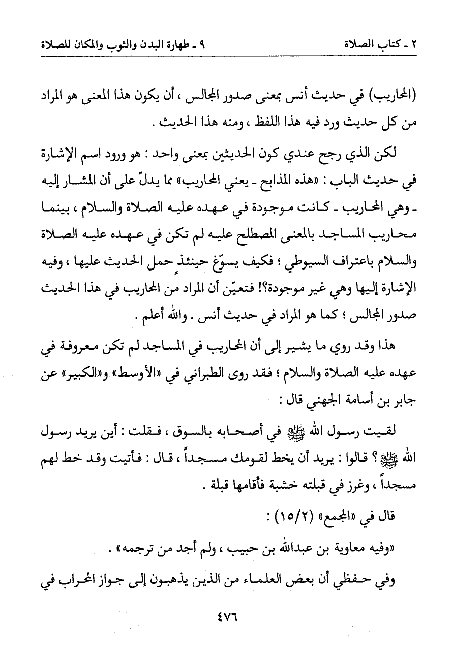 لكن الذي رجح عندي كون الحديثين بمعنى واحد: هو ورود اسم الإشارة في حديث الباب: (هذه المذابح - يعني المحاريب) مما يدل على أن المشارإليه - وهي المحاريب - كانت موجودة في عهده عليه الصلاة والسلام بينما محاريب المساجد بالمعنى المصطلح عليه لم تكن في عهده عليه الصلاة والسلام باعتراف السيوطي فكيف يسوغ حينئذ حمل الحديث عليها وفيه الإشارة إليها وهي غير موجودة؟ فتعين أن المراد من المحاريب في هذا الحديث صدور المجالس كما هو المراد في حديث أنس. والله أعلم