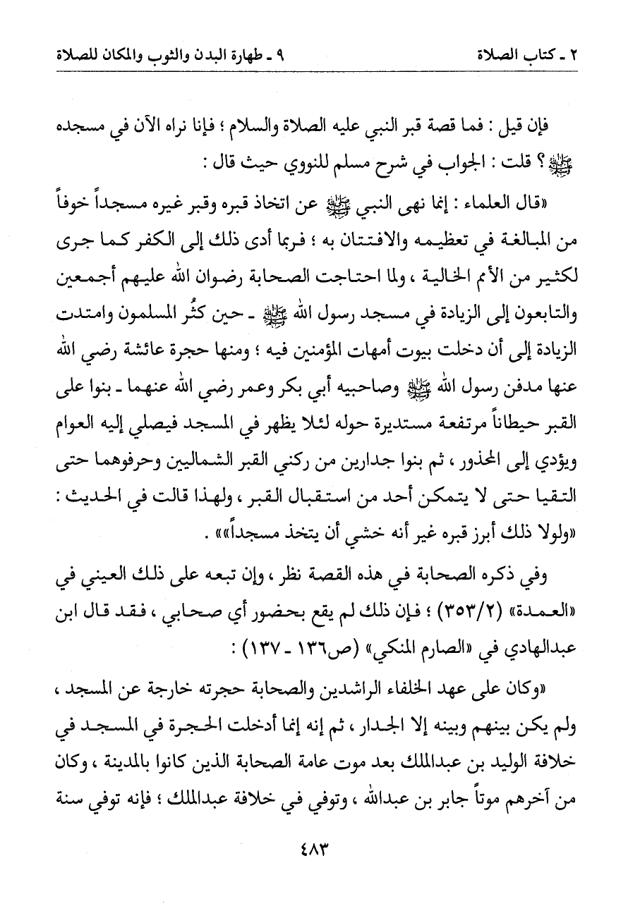 (قال العلماء: إنما نهى النبي صلى الله عليه وسلم عن اتخاذ قبره وقبر غيره مسجدا خوفا من المبالغة في التعظيم والافتتان به فربما أدى ذلك إلى الكفر كما جرى لكثير من الأمم الخالية ولما احتاجت الصحابة رضوان الله تعالى عليهم أجمعين والتابعون إلى الزيادة في مسجد رسول الله صلى الله عليه وسلم - حين كثر المسلمون وامتدت الزيادة إلى أن دخلت بيوت أمهات المؤمنين فيه ومنها حجرة عائشة رضي الله عنها مدفن رسول الله صلى الله عليه وسلم وصاحبيه أبي بكر وعمر رضي الله عنهما - بنو على القبر حيطانا مرتفعة مستديرة حوله لئلا يظهر في المسجد فيصلي إليه العوام ويؤدي إلىالمحذور ثم بنوا جدارين من ركني القبر الشماليين وحرفوهما حتى التقيا حتى لا يتمكن أحد من استقبال القبر ولهذا قالت في الحديث: