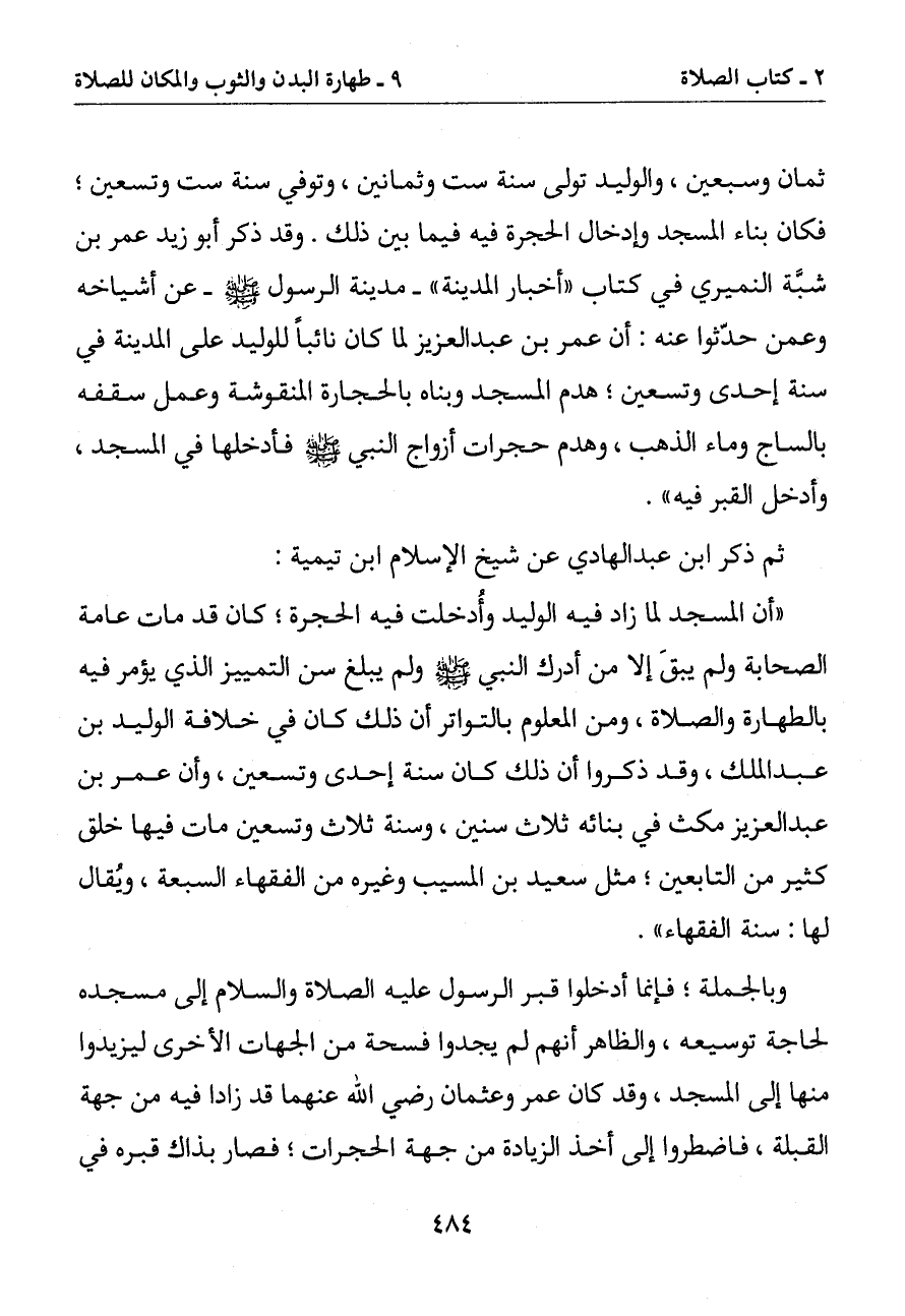(أن المسجد لما زاد فيه الوليد وأدخلت فيه الحجرة كان قد مات عامة الصحابة ولم يبق إلا من أدرك النبي صلى الله عليه وسلم ولم يبلغ سن التمييز الذي يؤمر فيه بالطهارة والصلاة ومن المعلوم بالتواتر أن ذلك كان في خلافة الوليد بن عبد الملك وقد ذكروا أن ذلك كان سنة إحدى وتسعين وأن عمر بن عبد العزيز مكث في بنائه ثلاث سنين وسنة ثلاث وتسعين مات فيها خلق كثير من التابعين مثل سعيد بن المسيب وغيره من الفقهاء السبعة ويقال لها: سنة الفقهاء)