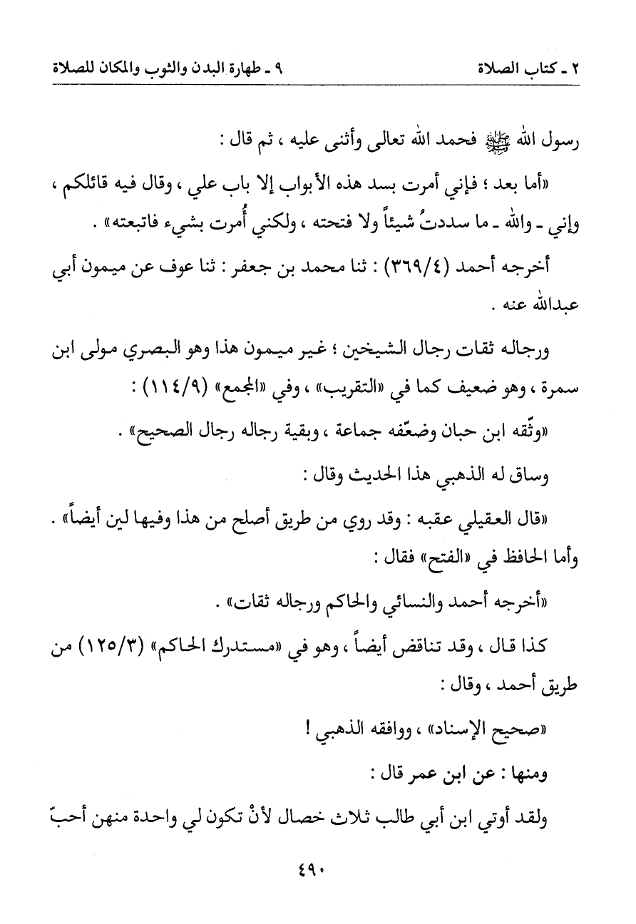 (أما بعد فإني أمرت بسد هذه الأبواب إلا باب علي وقال فيه قائلكم وإني - والله - ما سددت شيئا ولا فتحته ولكني أمرت بشيء فاتبعته)