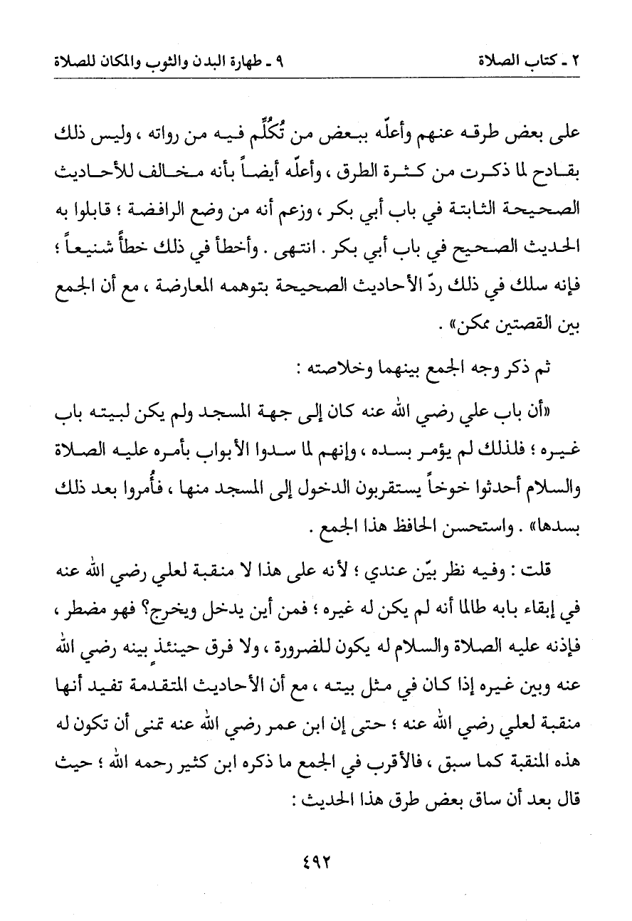 قلت: وفيه نظر بين عندي لأنه على هذا لا منقبة لعلي رضي الله عنه في إبقاء بابه طالما أنه لم يكن له غيره فمن أين يدخل ويخرج؟ فهو مضطر فإذنه عليه الصلاة والسلام له يكون للضرورة ولا فرق حينئذ بينه رضي الله عنه وبين غيره إذا كان في مثل بيته مع أن الأحاديث المتقدمة تفيد أنها منقبة لعلي رضي الله عنه حتى إن ابن عمر رضي الله عنه تمنى أن تكون له هذه المنقبة كما سبق فالأقرب في الجمع ما ذكره ابن كثير رحمه الله حيث قال بعد أن ساق بعض طرق هذا الحديث: