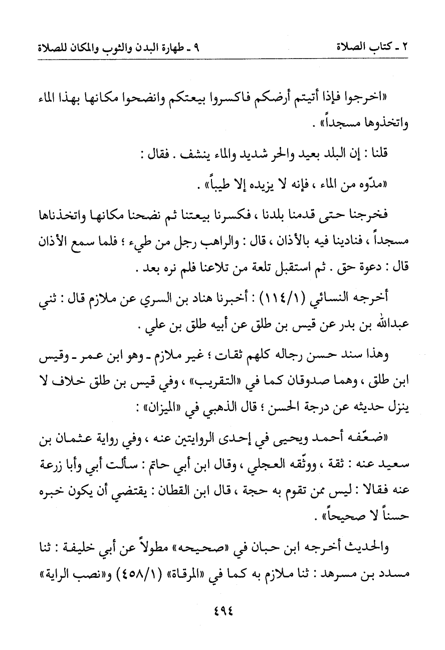 وهذا سند حسن رجاله كلهم ثقات غير ملازم - وهو ابن عمر - وقيس ابن طلق وهما صدوقان كما في (التقريب) وفي قيس بن طلق خلاف لاينزل حديثه عن درجة الحسن قال الذهبي في (الميزان):