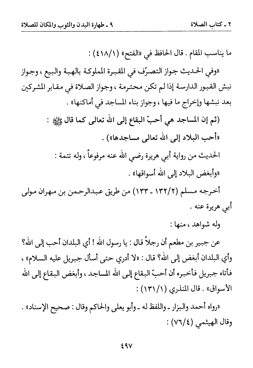 عن جبير بن مطعم أن رجلا قال: يا رسول الله أي البلدان أحب إلى الله؟ واي البلدان أبغض إلى الله؟ قال: (لا أدري حتى أسال جبريل عليه السلام) فأتاه جبريل فأخبره أن أحب البقاع إلى الله المساجد وأبغض البقاع إلى الله الأسواق). قال المنذري: