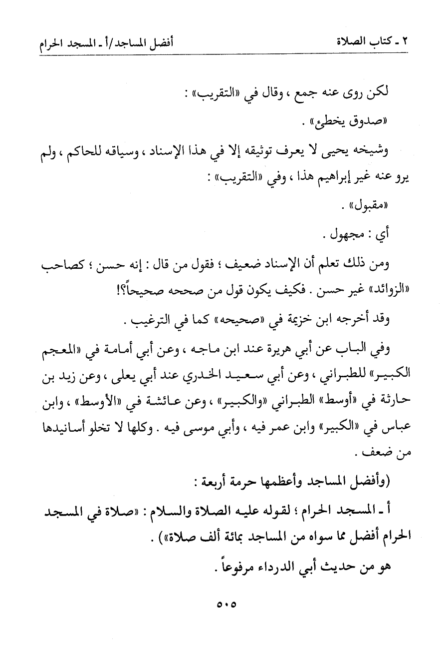 أ - المسجد الحرام لقوله عليه الصلاة والسلام: (صلاة في المسجد الحرام أفضل مما سواه من المساجد بمائة ألف صلاة)