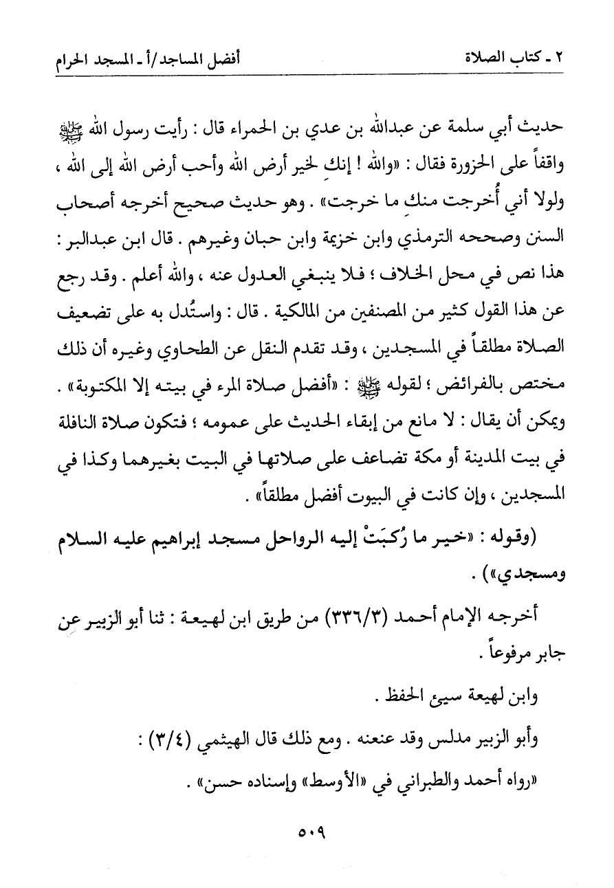 حديث أبي سلمة عن عبد الله بن عدي بن الحمراء قال: رأيت رسول الله صلى الله عليه وسلم واقفا على الحزورة فقال: (والله إنك لخير أرض الله وأحب أرض الله إلى الله ولولا أني أخرجت منك ما خرجت). وهو حديث صحيح أخرجه أصحاب السنن وصححه الترمذي وابن خزيمة وابن حبان وغيرهم. قال ابن عبد البر: هذا نص في محل الخلاف فلا ينبغي العدول عنه والله أعلم. وقد رجع عن هذا القول كثير من المصنفين من المالكية. قال: واستدل به على تضعيف الصلاة مطلقا في المسجدين وقد تقدم النقل عن الطحاوي وغيره أن ذلك مختص بالفرائض لقوله صلى الله عليه وسلم: (أفضل صلاة المرء في يته إلا المكتوبة). ويمكن أن يقال: لا مانع من إبقاء الحديث على عمومه فتكون صلاة النافلة في بيت المدينة أو مكة تضاعف على صلاتها في البيت بغيرهما وكذا في المسجدين وإن كانت في البيوت أفضل مطلقا)