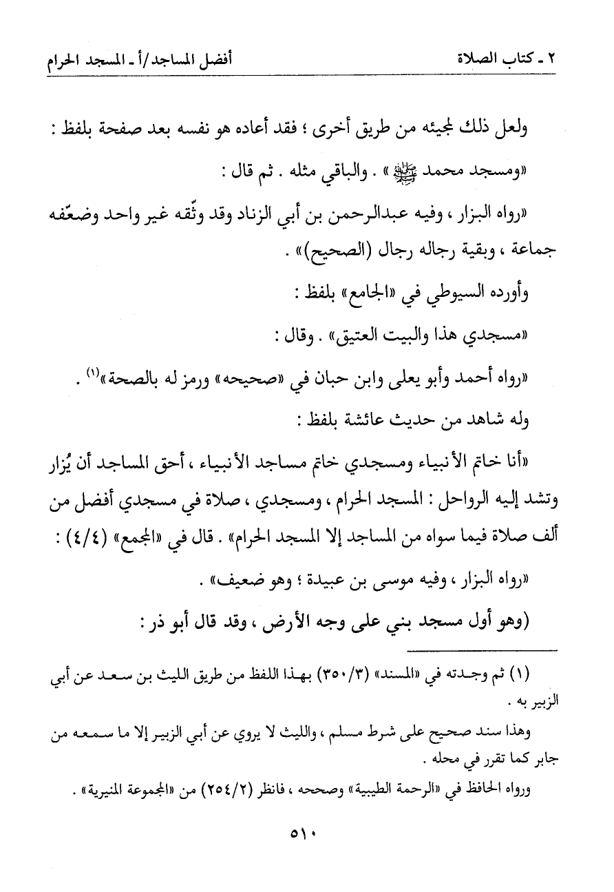 (أنا خاتم الأنبياء ومسجدي خاتم مساجد الأنبياء أحق المساجد أن يزار وتشد إليه الرواحل: المسجد الحرام ومسجدي صلاة في مسجدي أفضل من الف صلاة فيما سواه من المساجد إلا المسجد الحرام). قال في (المجمع):