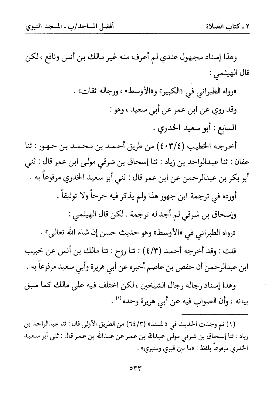 (1) ثم وجدت الحديث في (المسند) (3/ 64) من الطريق الأولى قال: ثنا عبد الواحد بن زياد: ثنا إسحا بن شرقي مولى عبد الله بن عمر عن عبد الله بن عمر قال: ثني أبو سعيد الخدري مرفوعا بلفظ: (ما بين قبري ومنبري)