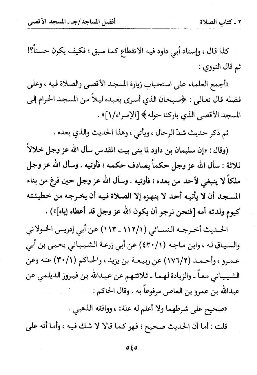(وقال: (إن سليمان بن داود لما بنى بيت المقدس سأل الله عز وجل خلالا ثلاثة: سأل الله عز وجل حكما يصادف حكمه فأوتيه. وسأل الله عز وجل ملكا لا ينبغي لأحد من بعده فأوتيه. وسأل الله عز وجلهـ حين فرغ من بناء المسجد أن لا يأتيه أحد لا ينهزه إلا للصلاة فيه أن يخرجه من خطيئته كيوم ولدته أمه [فنحن نرجو أن يكون الله عز وجل قد أعطاه إياه])
