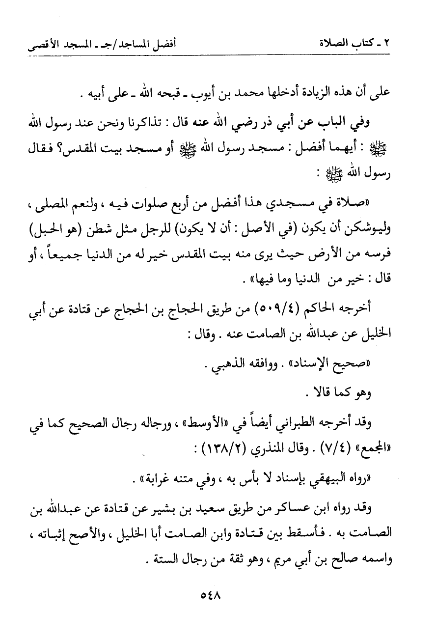 (صلاة في مسجدي هذا أفضل من أربع صلوات فيه ولنعم المصلى وليوشكن أن يكون (في الأصل: أن لا يكون) للرجل مثل شطن (هو الحبل) فرسه من الأرض حيث يرى منه بيت المقدس خير له من الدنيا جميعا أو قال: خير من الدنيا وما فيها)
