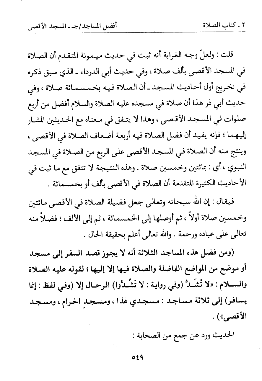 قلت: ولعل وجه الغرابة أنه ثبت في حديث ميمونة المتقدم أن الصلاة في المسجد الأقصى بألف صلاة وفي حديث أبي الدرداء - الذي سبق ذكره في تخريج أول أحاديث المسجد - أن الصلاة فيه بخمسمائة صلاة وفي حديث أبي ذر هذا أن صلاة في مسجده عليه الصلاة والسلام أفضل من أربع صلوات في المسجد الأقصى وهذا لا يتفق في معناه في الحديثين المشار إليهما فإنه يفيد أن فضل الصلاة فيه أربعة أضعاف الصلاة في الأقصى وينتج منه أن الصلاة في المسجد الأقصى على الربع من الصلاة في المسجد النبوي أي: بمائتين وخمسين صلاة. وهذه النتيجة لا تتفق مع ما ثبت في الأحاديث الكثيرة المتقدمة أن الصلاة في الأقصى بألف أو بخمسمائة
