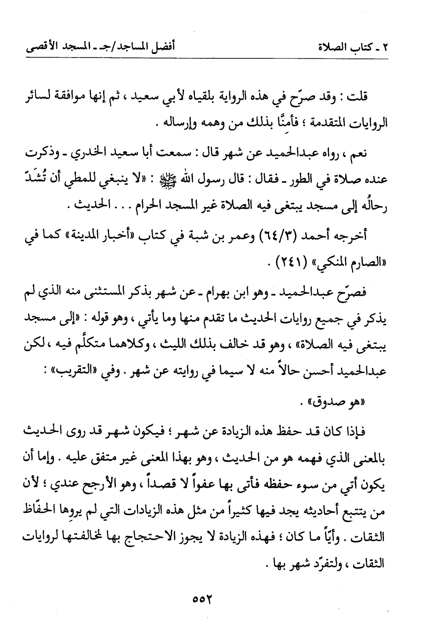 فصرح عبد الحميد - وهو ابن بهرام - عن شهر بذكر المستثنى منه الذي لم يذكر في جميع روايات الحديث ما تقدم منها وما يأتي وهو قوله: (إلى مسجد يبتغى فيه الصلاة) هو قد خالف بذلك الليث وكلاهما متكلم فيه لكن عبد الحميد أحسن حالا منه لا سيما في روايته عن شهر. وفي (التقريب) [: