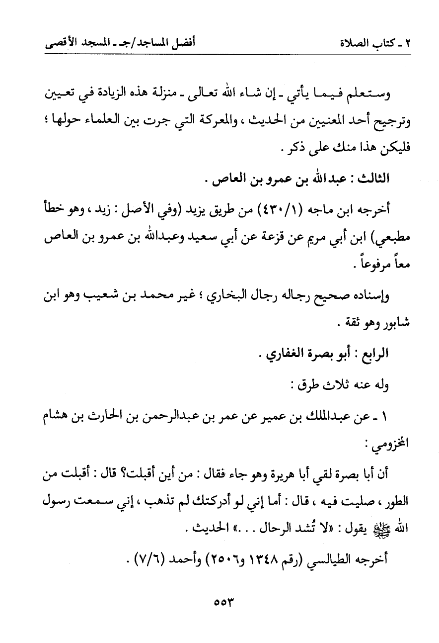 أن أبا بصرة لقي أبا هريرة وهو جاء فقال: من أين أقبلت؟ قال: أقبلت من الطور صليت فيه قال: أما إني لو أدركتك لم تذهب إني سمعت رسول الله صلى الله عليه وسلم يقول: (لا تشد الرحال. . .) الحديث