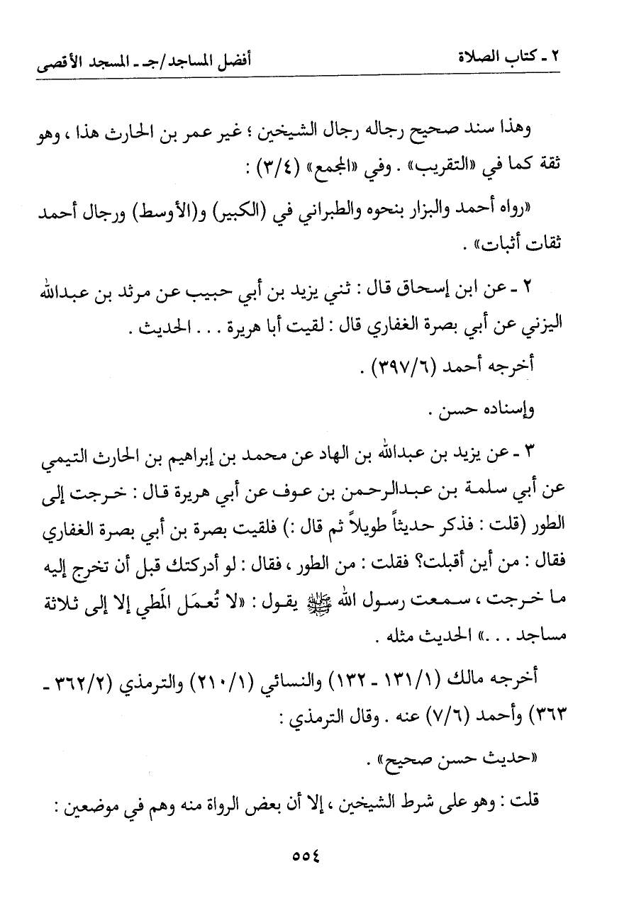 3 - عن يزيد بن عبد الله بن الهاد عن محمد بن إبراهيم بن الحارث التيمي عن أبي سلمة بن عبد الرحمن بن عوف عن أبي هريرة قال: خرجت إلى الطور (قلت: فذكر حديثا طويلا ثم قال:) فلقيت بصرة بن أبي بصرة الغفاري فقال: من أين أقبلت؟ فقلت: من الطور فقال: لو أدركتك قبل أن تخرج إليه ما خرجت سمعت رسول الله صلى الله عليه وسلم يقول: (لا تعمل المطي إلا إلى ثلاثة مساجد. . .) الحديث مثله