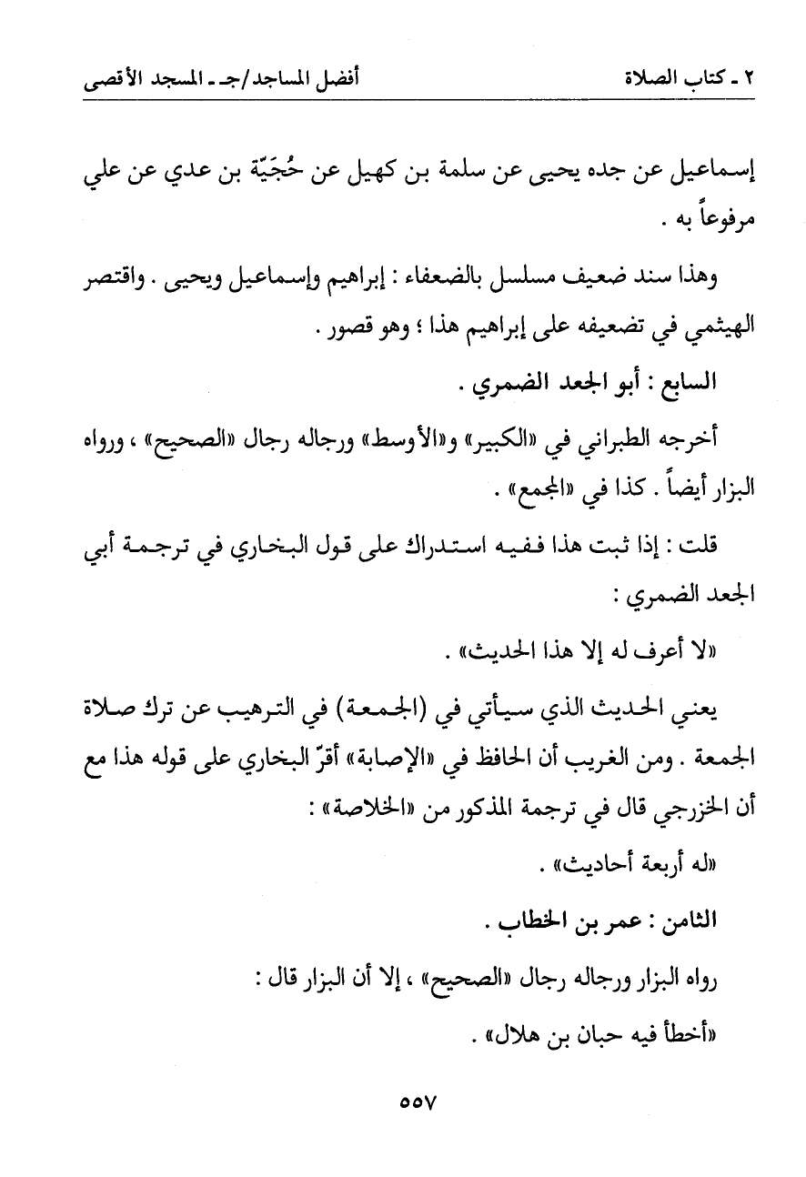 يعني الحديث الذي سيأتي في (الجمعة) في الترهيب عن ترك صلاة الجمعة. ومن الغريب أن الحافظ في (الإصابة) أقر البخاري على قوله هذا مع أن الخزرجي قال في ترجمة المذكور من (الخلاصة):