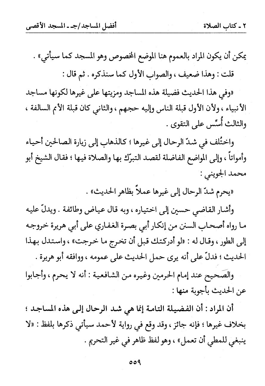 وأشار القاضي حسين إلى اختياره وبه قال عياض وطائفة. ويدل عليه ما رواه أصحاب السنن من إنكار أبي بصرة الغفاري على أبي هريرة خروجه إلى الطور وقال له: (لو أدركتك قبل أن تخرج ما خرجت) واستدل بهذا الحديث فدل على أنه يرى حمل الحديث على عمومه ووافقه أبو هريرة