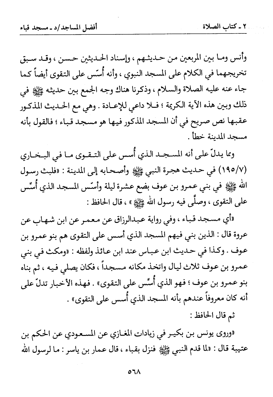(أي مسجد قباء وفي رواية عبد الرزاق عن معمر عن ابن شهاب عن عروة قال: الذين بني فيهم المسجد الذي أسس على التقوى هم بنوا عمرو بن عوف. وكذا في حديث ابن عباس عند ابن عائذ ولفظه: (ومكث في بني عمرو بن عوف ثلاث ليال واتخذ مكانه مسجدا فكان يصلي فيه ثم بناه بنو عمرو بن عوف فهو الذي أسس على التقوى). فهذه الأخبار تدل على أنه كان معروفا عندهم بأنه المسجد الذي أسس على التقوى)