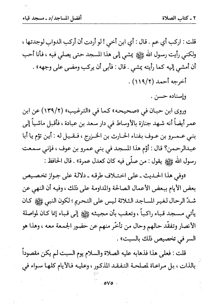 وروى ابن حبان في (صحيحه) كما في (الترغيب) (2/ 139) عن ابن عمر أيضا أنه شهد جنازة بالأوساط في دار سعد بن عبادة فأقبل ماشيا إلى بني عمرو بن عوف بفناء الحارث بن الخزرج فقيل له: أين تؤم يا أبا عبد الرحمن؟ قال: أؤم هذا المسجد في بني عمرو بن عوف فإني سمعت رسول الله صلى الله عليه وسلم يقول: من صلى فيه كان كعدل عمرة). قال الحافظ: