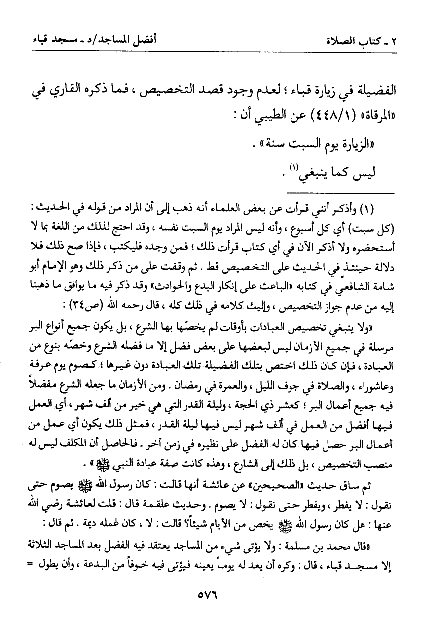 (1) وأذكر أنني قرأت عن بعض العلماء أنه ذهب إلى أن المراد من قوله في الحديث: (كل سبت) أي كل أسبوع وأنه ليس المراد يوم السبت نفسه وقد احتج لذلك من اللغة بما لا أستحضره ولا أذكر الآن في أي كتاب قرأت ذلك فمن وجده فليكتب فإذا صح ذلك فلا دلالة حينئذ في الحديث على التخصيص قط. ثم وقفت على من ذكر ذلك وهو الإمام أبو شامة الشافعي في كتابه (الباعث على إنكار البدع والحوادث) وقد ذكر فيه ما يوافق ما ذهبنا إله من عدم جواز التخصيص وإليك كلامه في ذلك كله قال رحمه الله (ص 34):