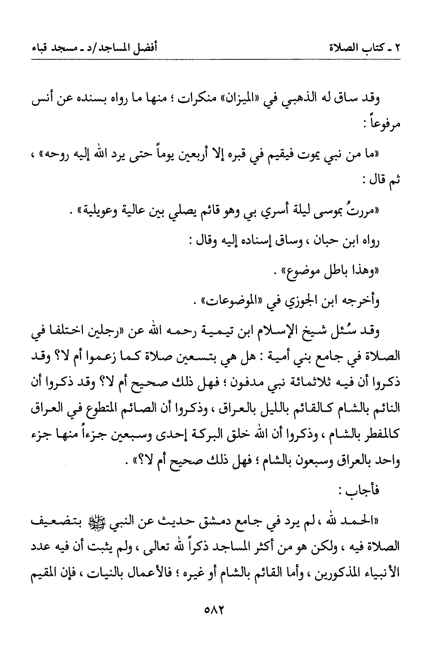 وقد سئل شيخ الإسلام ابن تيمية رحمه الله عن (رجلين اختلفا في الصلاة في جامع بني أمية: هل هي بتسعين صلاة كما زعموا أم لا؟ وقد ذكروا أن فيه ثلاثمائة نبي مدفون فهل ذلك صحيح أم لا؟ وقد ذكروا أن النائم بالشام كالقائم بالليل بالعراق وذكروا أن الصائم المتطوع في العراق كالمفطر بالشام وذكروا أن الله خلق البركة إحدى وسبعين جزءا منها جزء واحد بالعراق وسبعون بالشام فهل ذلك صحيح أم لا؟)