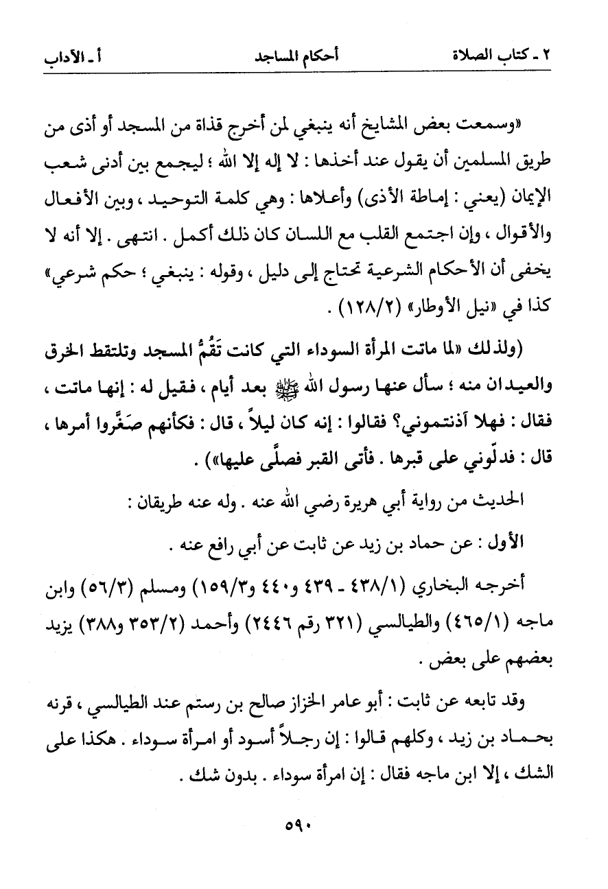 (وسمعت بعض المشايخ أنه ينبغي لمن أخرج قذاة من المسجد أو أذى من طريق المسلمين أن يقول عند أخذها: لا إله إلا الله ليجمع بين أدنى شعب الإيمان (يعني: إماطة الأذى) وأعلاها: وهي كلمة التوحيد وبين الأفعال والأقوال وإن اجتمع القلب مع اللسان كان ذلك أكمل. انتهى. إلا أنه لا يخفى أن الأحكام الشرعية تحتاج إلى دليل وقوله: ينبغي حكم شرعي) كذا في (نيل الأوطار) (2/ 128)