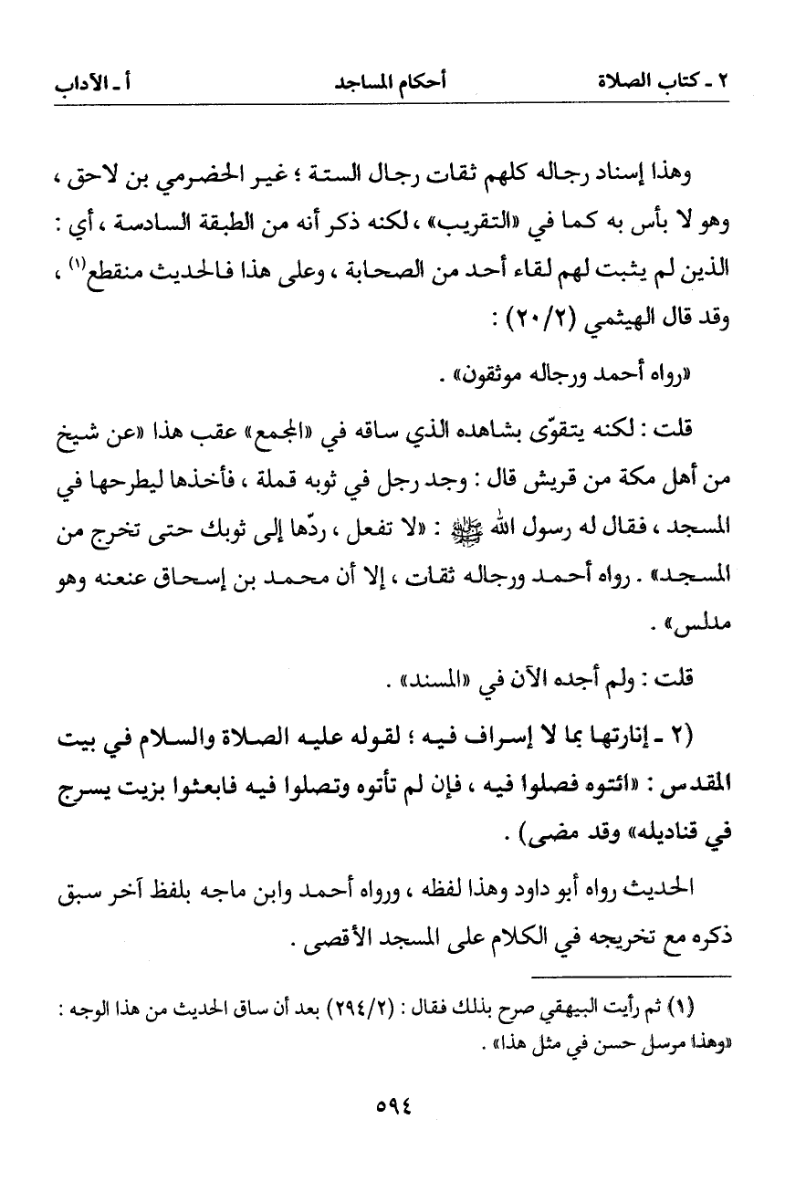 (2 - إنارتها بما لا إسراف فيه لقوله عليه الصلاة والسلام في بيت المقدس: (ائتوه فصلوا فيه فإن لم تأتوه وتصلوا فيه فابعثوا بزيت يسرج في قناديله) وقد مضى)