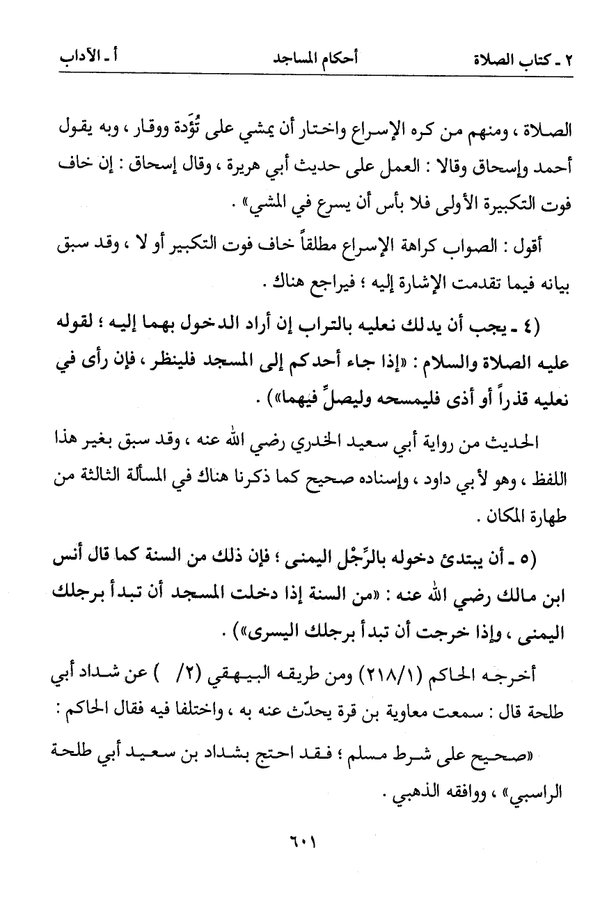 (4 - يجب أن يدلك نعليه بالتراب إن أراد الدخول بهما إليه لقوله عليه الصلاة والسلام: (إذا جاء أحدكم إلى المسجد فلينظر فإن رأى في نعليه قذرا أو أذى فليمسحه وليصل فيهما)