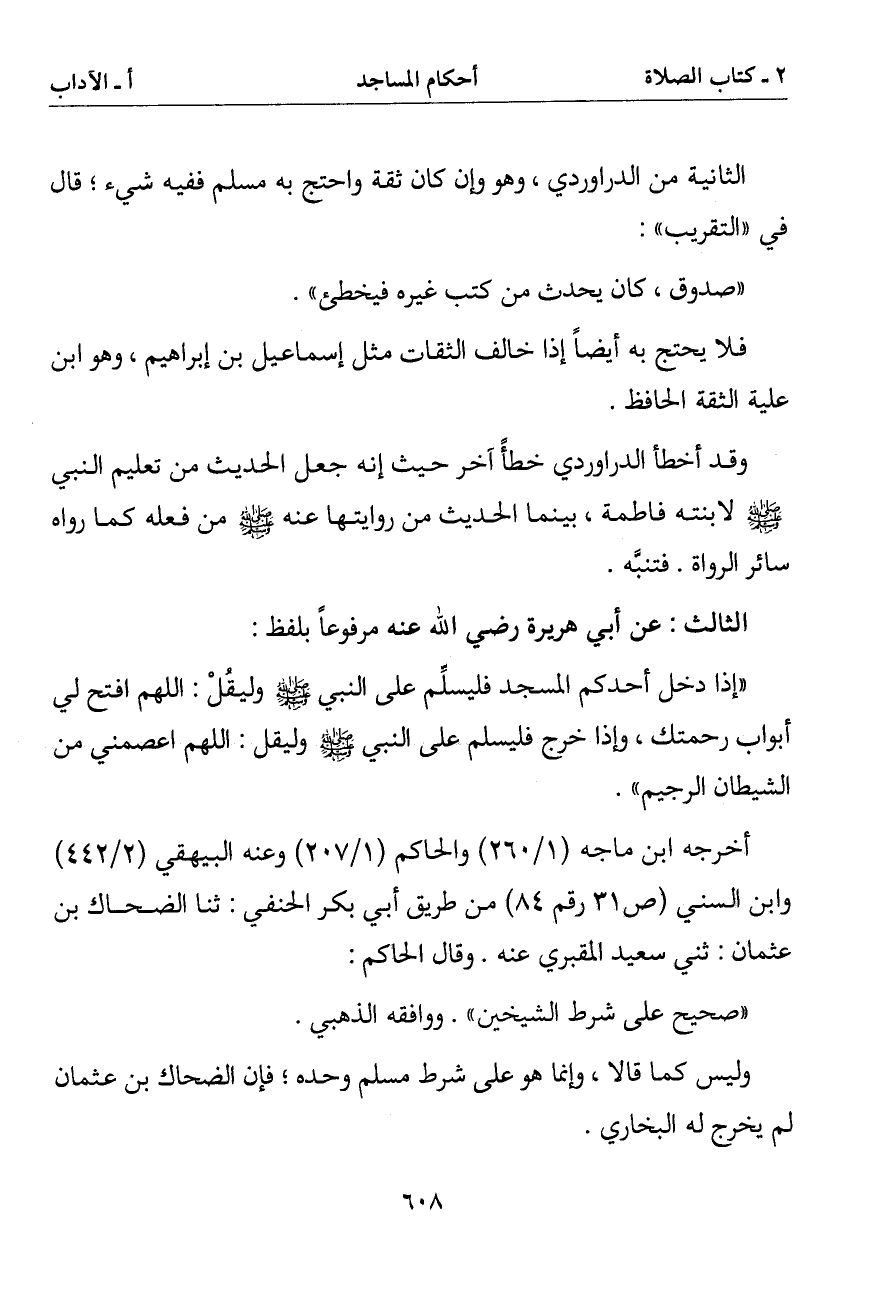 وقد أخطأ الدراوردي خطأ آخر حيث إنه جعل الحديث من تعليم النبي صلى الله عليه وسلم لابنته فاطمة بينما الحديث من روايتها عنه صلى الله عليه وسلم من فعله كما رواه سائر الرواة فتنبه