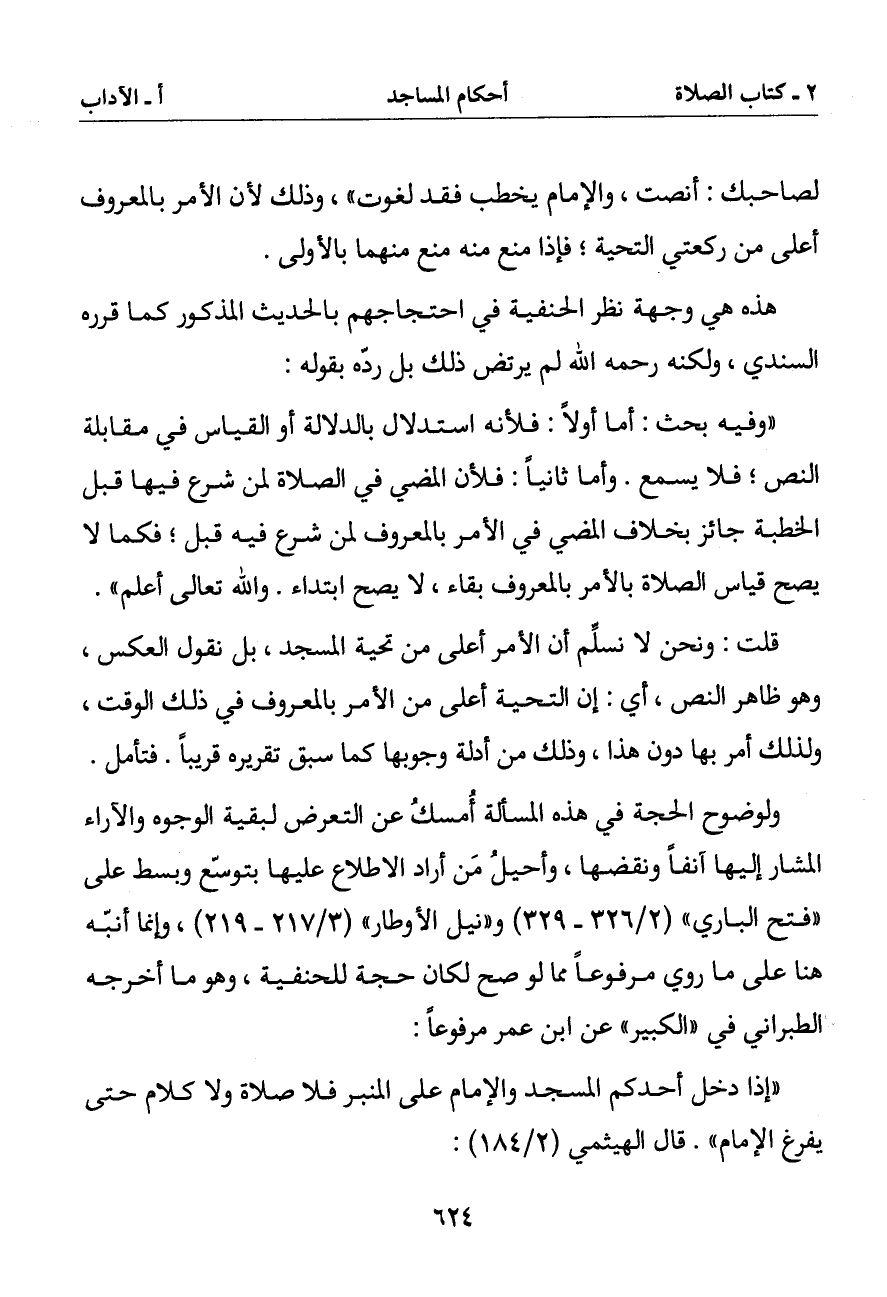 قلت: ونحن لا نسلم أن الأمر أعلى من تحية المسجد بل نقول العكس وهو ظاهر النص أي: إن التحية أعلى من الأمر بالمعروف في ذلك الوقت ولذلك أمر بها دون هذا وذلك من أدلة وجوبها كما سبق تقريره قريبا. فتأمل