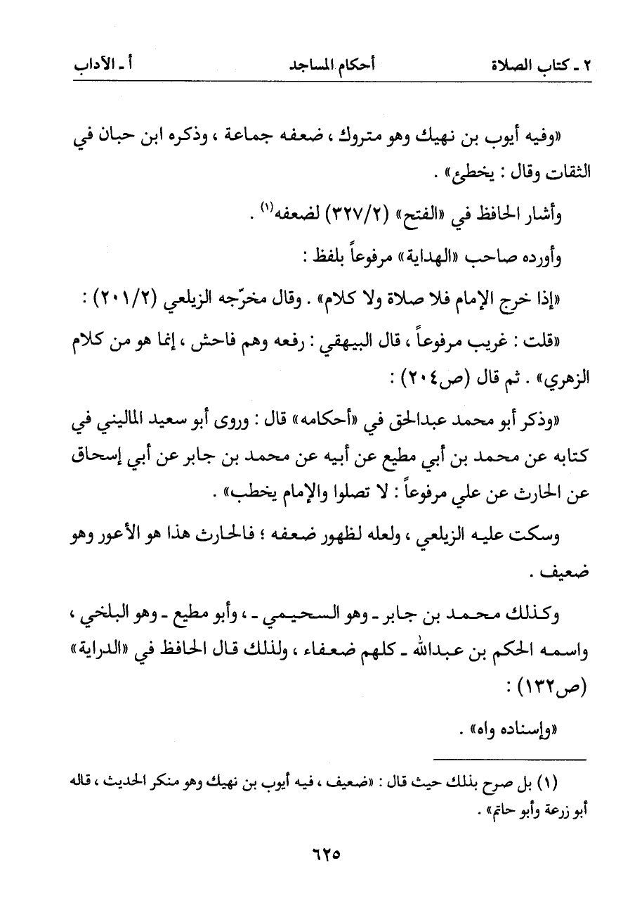 (وذكرأبو محمد عبد الحق في (أحكامه) قال: وروى أبو سعيد الماليني في كتابه عن محمد بن أبي مطيع عن أبيه عن محمد بن جابر عن أبي إسحاق عن الحارث عن علي مرفوعا: لا تصلوا والإمام يخطب)