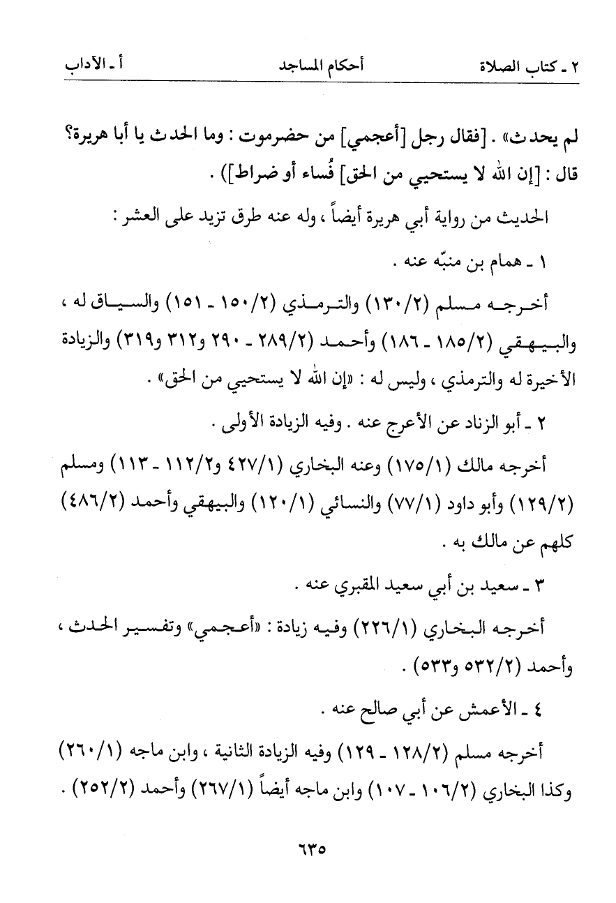 فقال رجل [أعجمي] من حضرموت: وما الحدث يا أبا هريرة؟ قال: [إن الله لا يستحيي من الحق] فساء أو ضراط])