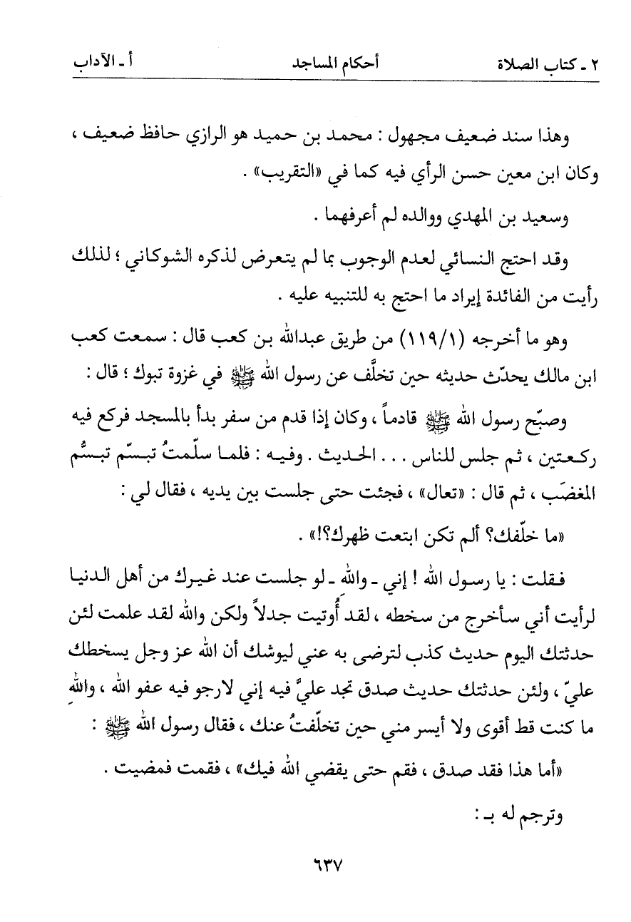 وصبح رسول الله صلى الله عليه وسلم قادما وكان إذا قدم من سفر بدأ بالمسجد فركع فيه ركعتين ثم جلس للناس. . . الحديث. وفيه: فلما سلمت تبسم تبسم المغضب ثم قال: (تعال) فجئت حتى جلست بين يديه فقال لي:
