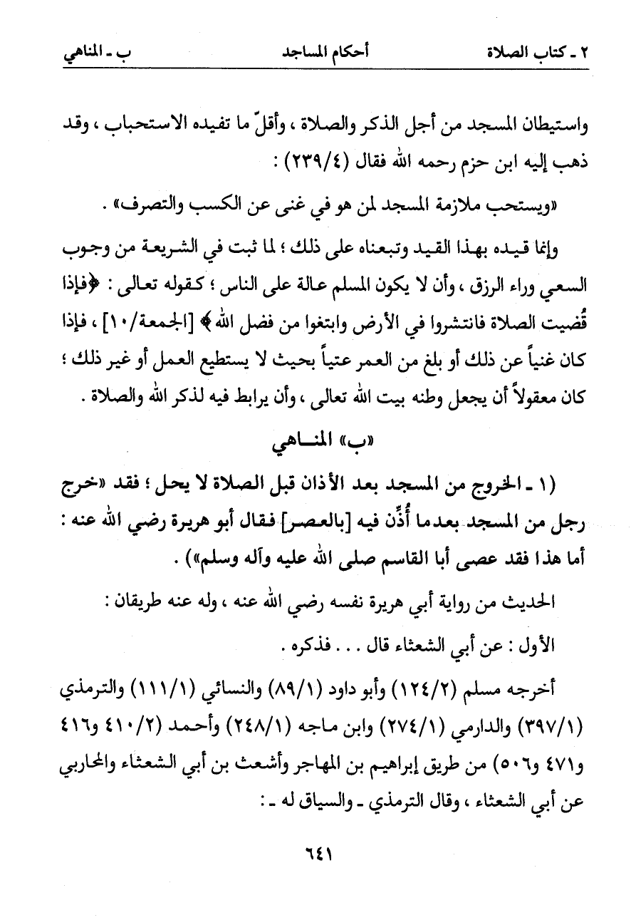 (1 - الخروج من المسجد بعد الأذان قبل الصلاة لا يحل فقد (خرج رجل من المسجد بعدما أذن فيه [بالعصر] فقال أبو هريرة رضي الله عنه: أما هذا فقد عصى أبا القاسم صلى الله عليه وآله وسلم)