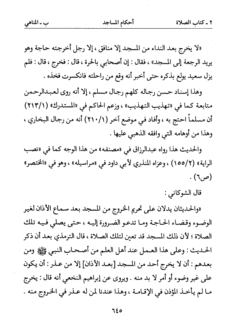 (والحديثان يدلان على تحريم الخروج من المسجد بعد سماع الأذان لغير الوضوء وقضاء الحاجة وما تدعو الضرورة إليه حتى يصلي فيه تلك الصلاة لأن ذلك المسجد قد تعين لتلك الصلاة قال الترمذي بعد أن ذكر الحديث: وعلى هذا العمل عند أهل العلم من أصحاب النبي صلى الله عليه وسلم ومن بعدهم: أن لا يخرج أحد من المسجد [بعد الأذان] إلا من عذر: أن يكون على غير وضوء أو أمر لا بد منه. ويروى عن إبراهيم النخعي أنه قال: يخرج ما لم يأخذ المؤذن في الإقامة وهذا عندنا لمن له عذر في الخروج منه.
