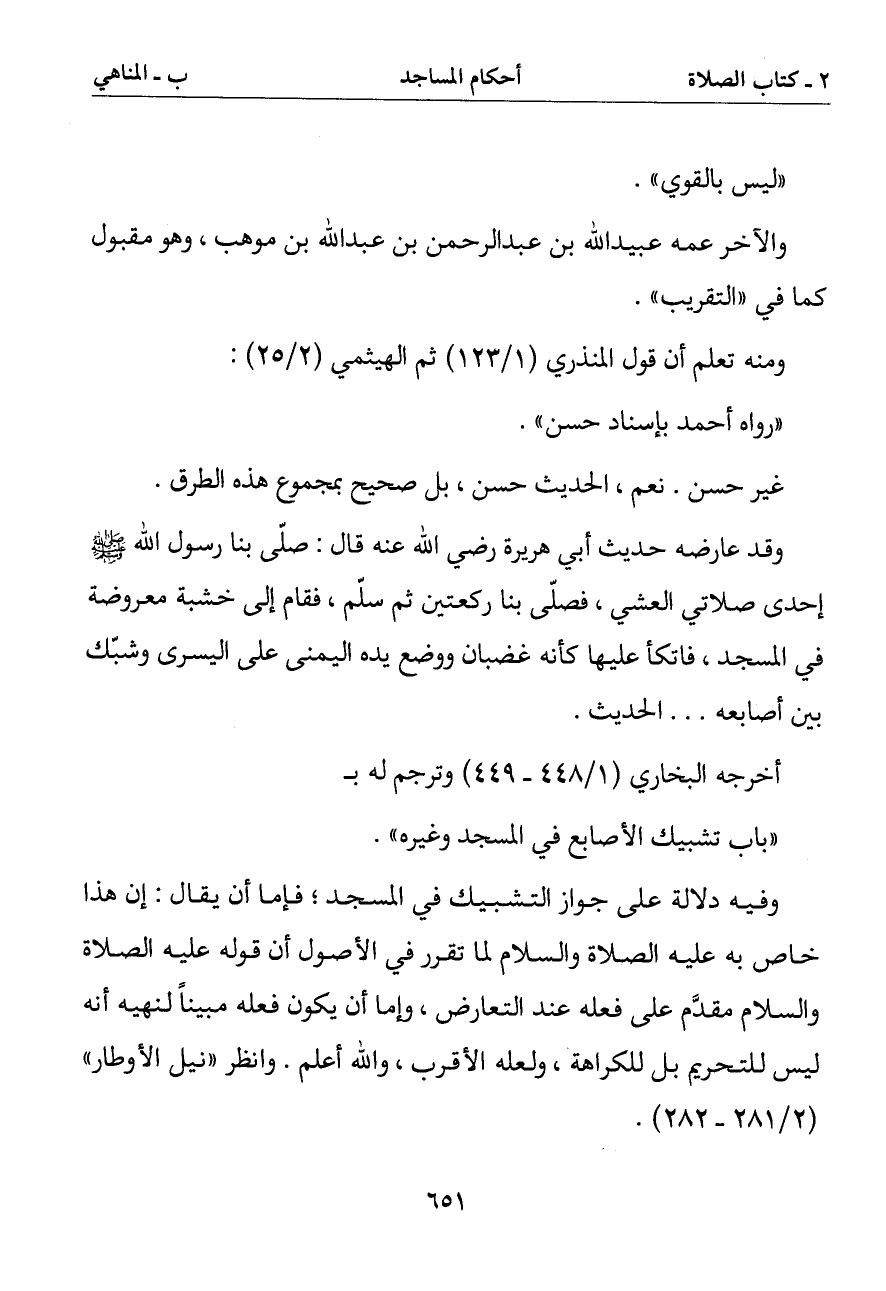 وفيه دلالة على جواز التشبيك في المسجد فإما أن يقال: إن هذا خاص به عليه الصلاة والسلام لما تقرر في الأصول أن قوله عليه الصلاة والسلام مقدم على فعله عند التعارض وإما أن يكون فعله مبينا لنهيه أنه ليس للتحريم بل للكراهة ولعله الأقرب والله أعلم. وانظر (نيل الأوطار)