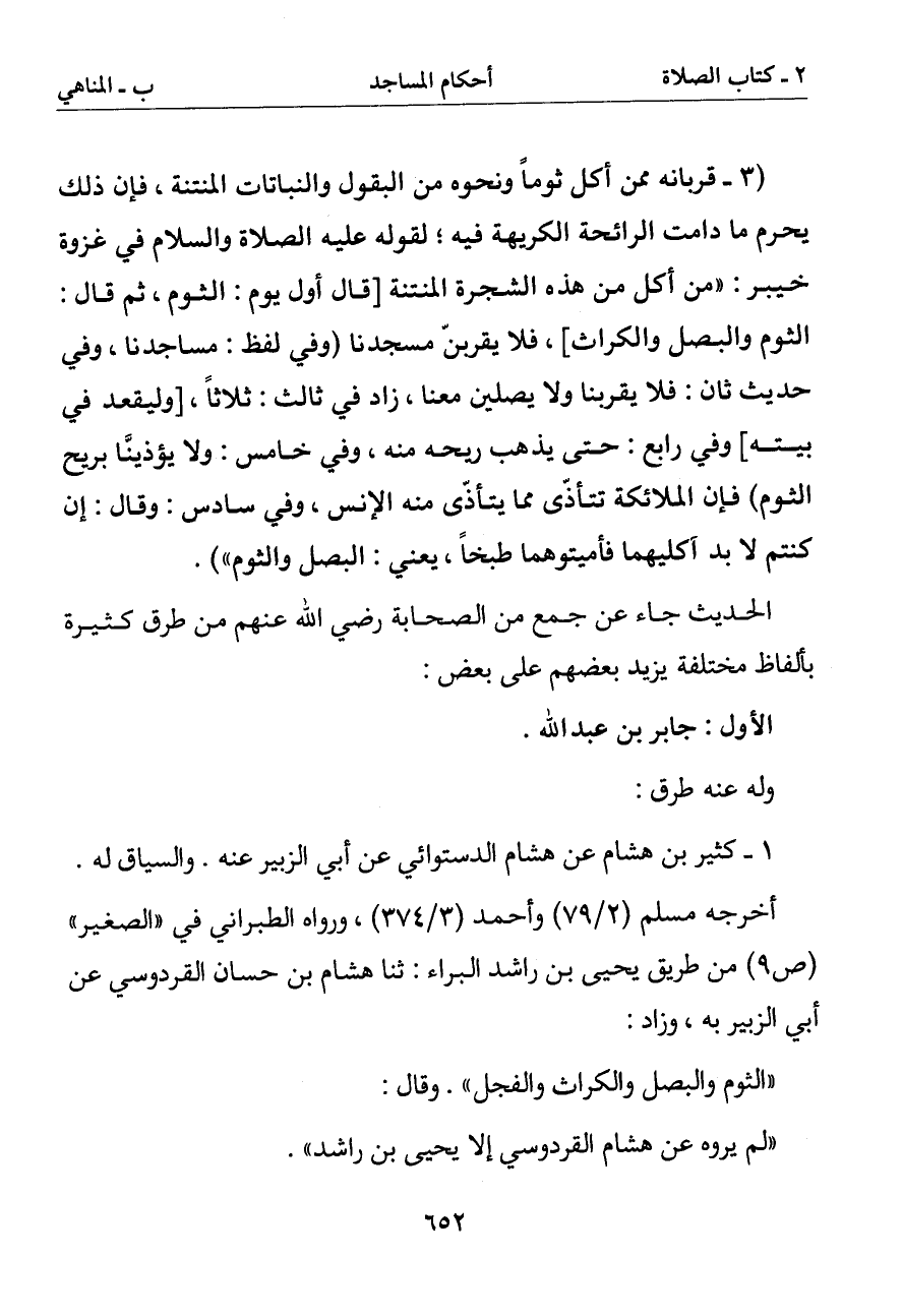 (3 - قربانه ممن أكل ثوما ونحوه من البقول والنباتات المنتنة فإن ذلك يحرم ما دامت الرائحة الكريهة فيه لقوله عليه الصلاة والسلام في غزوة خيبر: (من أكل من هذه الشجرة المنتنة [قال أول يوم: الثوم ثم قال: الثوم والبصل والكراث] فلا يقربن مسجدنا (وفي لفظ: مساجدنا وفي حديث ثاني: فلا يقربنا ولا يصلين معنا زاد في ثالث: ثلاثا [وليقعد في بيته] وفي رابع: حتى يذهب ريحه منه وفي خامس: ولا يؤذينا بريح الثوم) فإن الملائكة تتأذى مما يتأذى منه الإنس وفي سادس: وقال: إن كنتم لا بد أكليهما فأميتوهما طبخا يعني: البصل والثوم)